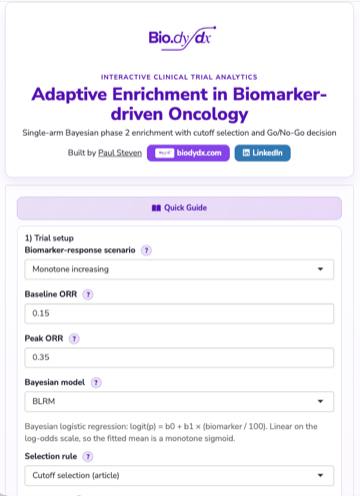 Interactive R/Shiny app for simulating adaptive enrichment in biomarker-driven oncology trials.